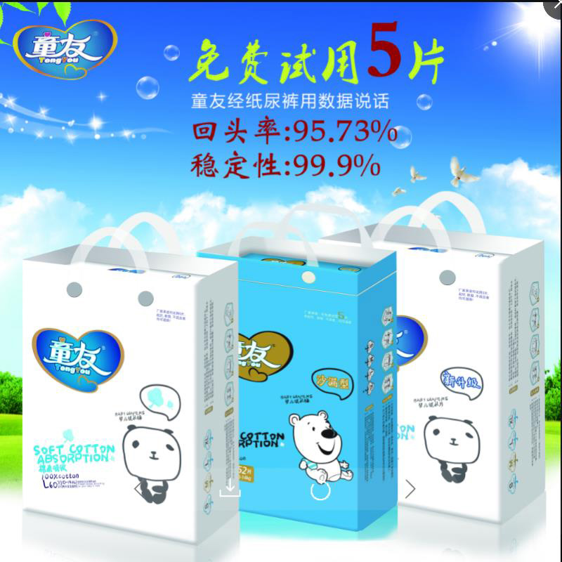 品牌名稱:童友 主營產(chǎn)品:童友嬰幼兒尿褲,尿片,拉拉褲 品牌特色:超薄雙熱風(fēng),手感柔軟,減少紅屁屁,吸尿量多,不反滲