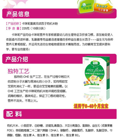 卡咪呢有機米粉系列是專為中國寶寶設(shè)計的營養(yǎng)輔食,選用有機大米,科學(xué)搭配維生素AD等維生素,還特別添加;撬、DHA、AA等有助智力發(fā)育的營養(yǎng)成分,富含15種營養(yǎng)素,F(xiàn)上?ㄟ淠啬笅胗闷酚邢薰久嫦蛉珖瞻资袌鰠^(qū)域誠招卡咪呢有機米粉代理商。