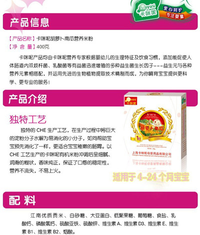 卡咪呢有機米粉系列是專為中國寶寶設(shè)計的營養(yǎng)輔食,選用有機大米,科學(xué)搭配維生素AD等維生素,還特別添加;撬、DHA、AA等有助智力發(fā)育的營養(yǎng)成分,富含15種營養(yǎng)素。現(xiàn)上?ㄟ淠啬笅胗闷酚邢薰久嫦蛉珖瞻资袌鰠^(qū)域誠招卡咪呢有機米粉代理商。