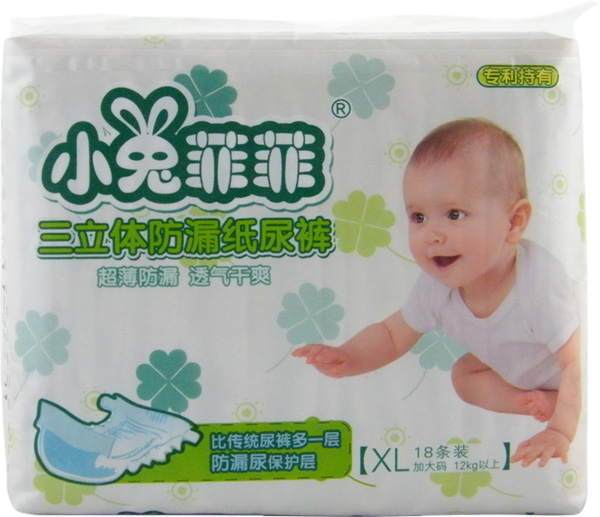 小兔菲菲三立體防漏紙尿褲是廣州咕嚕咕嚕嬰幼兒用品有限公司主打品牌產(chǎn)品。產(chǎn)品采用4層組合吸水芯片,能夠快速吸收尿液,避免尿液對(duì)寶寶肌膚的刺激,有效預(yù)防寶寶紅屁屁。