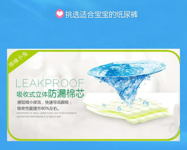 柔薄芯層結(jié)構(gòu),采用全芯高科技結(jié)構(gòu)設(shè)計(jì)、薄軟透氣、零接觸摩擦感、不起坨、不斷層、輕輕的呵護(hù),給寶寶體貼的愛。綿柔無紡布透氣底膜,及時(shí)散發(fā)悶熱濕氣,減少寶寶皮膚的刺激及傷害。全新3D打孔大珍珠面層,瞬間吸收,加倍干爽,連通吸收芯成(多層鎖水)系統(tǒng),有效吸收和鎖住更多尿液,讓寶寶屁屁更加干爽。雙重防漏立體設(shè)計(jì),舒適柔軟貼合腿部,防止尿尿往兩邊側(cè)漏,給寶寶自由自在,盡情活動(dòng)的舒爽空間。人性化合身曲線剪裁,專為中國寶寶設(shè)計(jì)的合身檔剪裁,更加貼合寶寶,腿部及臀部曲線,減少腿部摩擦與壓力。背部彈性腰圍貼身防后漏,無論寶寶坐、騎、爬等,大環(huán)腰彈性腰圍能自然伸縮,貼身服帖。