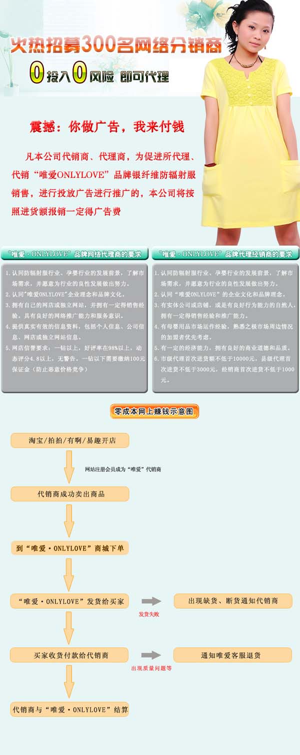 公司面向國(guó)內(nèi)市場(chǎng),以時(shí)尚孕婦裝、納米銀纖維防輻射服裝為主導(dǎo)產(chǎn)品,擁有一流的設(shè)計(jì)研發(fā)隊(duì)伍、一流的生產(chǎn)力量、獨(dú)特營(yíng)銷理念、全方位的客戶服務(wù),努力用一年的時(shí)間使“唯愛ONLYLOVE”成為知名互聯(lián)網(wǎng)品牌,進(jìn)而成為行業(yè)領(lǐng)導(dǎo)品牌!