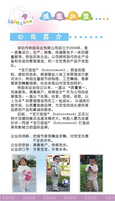 深圳市秋韻實(shí)業(yè)有限公司成立于2000年,是一家集設(shè)計(jì)、生產(chǎn)、銷(xiāo)售、終端服務(wù)于一體的嬰童服飾、用品實(shí)體企業(yè)。公司擁有現(xiàn)代的生產(chǎn)設(shè)備和先進(jìn)的管理理念,和一支優(yōu)秀的產(chǎn)品開(kāi)發(fā)團(tuán)隊(duì)。
