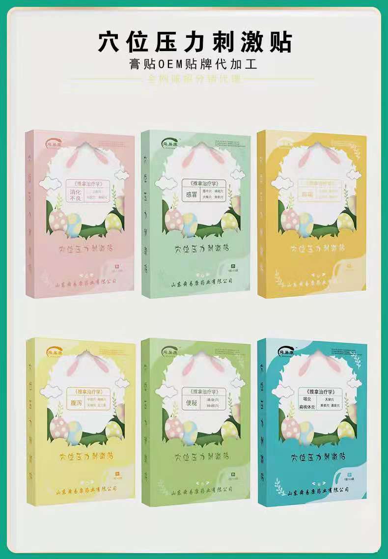 穴位壓力刺激貼小兒的系列比較多,穴位壓力刺激貼通過刺激穴位的作用來治療一些常見的疾病,比如感冒、咳嗽、退熱、積食、咽炎、扁桃體炎等等常見病。都有較好的治療功效。山東舜易康藥業(yè),源頭工廠,貼牌定制代加工18853051565