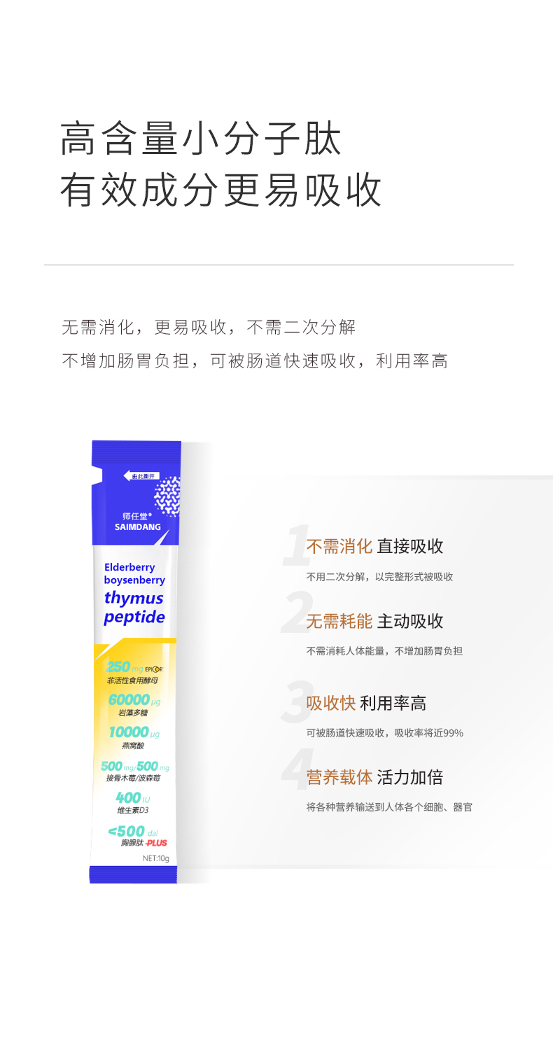 小袋包裝設(shè)計(jì),隨吃隨開,避免氧化變質(zhì),方便攜帶,每天1條,輕松補(bǔ)充營養(yǎng)。師任堂接骨木莓+波森莓小肽飲憑借其安全、營養(yǎng)、便捷的特點(diǎn),迅速成為兒童營養(yǎng)市場的熱門選擇,F(xiàn)誠邀全國渠道合作伙伴,攜手共贏,共同開拓兒童健康新藍(lán)海!