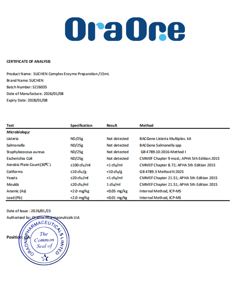 產(chǎn)品為新西蘭原裝進口,生產(chǎn)商奧拉具備新西蘭藥廠級生產(chǎn)資質(zhì),并通過HACCP、GMP、FDA等國際權(quán)威體系認(rèn)證,生產(chǎn)環(huán)境與質(zhì)控體系達(dá)到藥品級標(biāo)準(zhǔn),該復(fù)配酶制劑類產(chǎn)品適用于新西蘭食品及膳食補充劑的生產(chǎn)和加工。