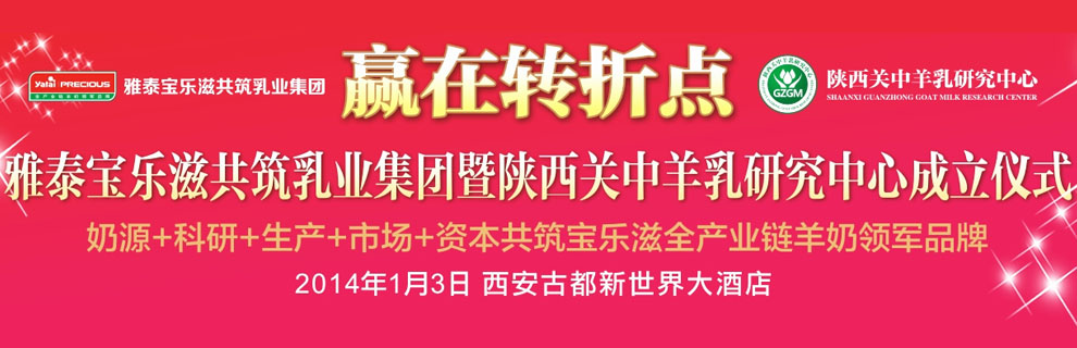 2014年1月3日,雅泰寶樂滋共筑乳業(yè)集團(tuán)暨陜西關(guān)中羊乳研究中心成立儀式在西安古都新世界大酒店秦皇廳于早上9點(diǎn)30分正式拉開帷幕。此次活動主要有兩大主題。第一大主題是雅泰寶樂滋強(qiáng)強(qiáng)聯(lián)合,共筑乳業(yè)集團(tuán);另一大主題是陜西關(guān)中羊乳研究中心的成立;鸨瑡胪W(wǎng)作為行業(yè)應(yīng)邀媒體出席并全程報(bào)道。