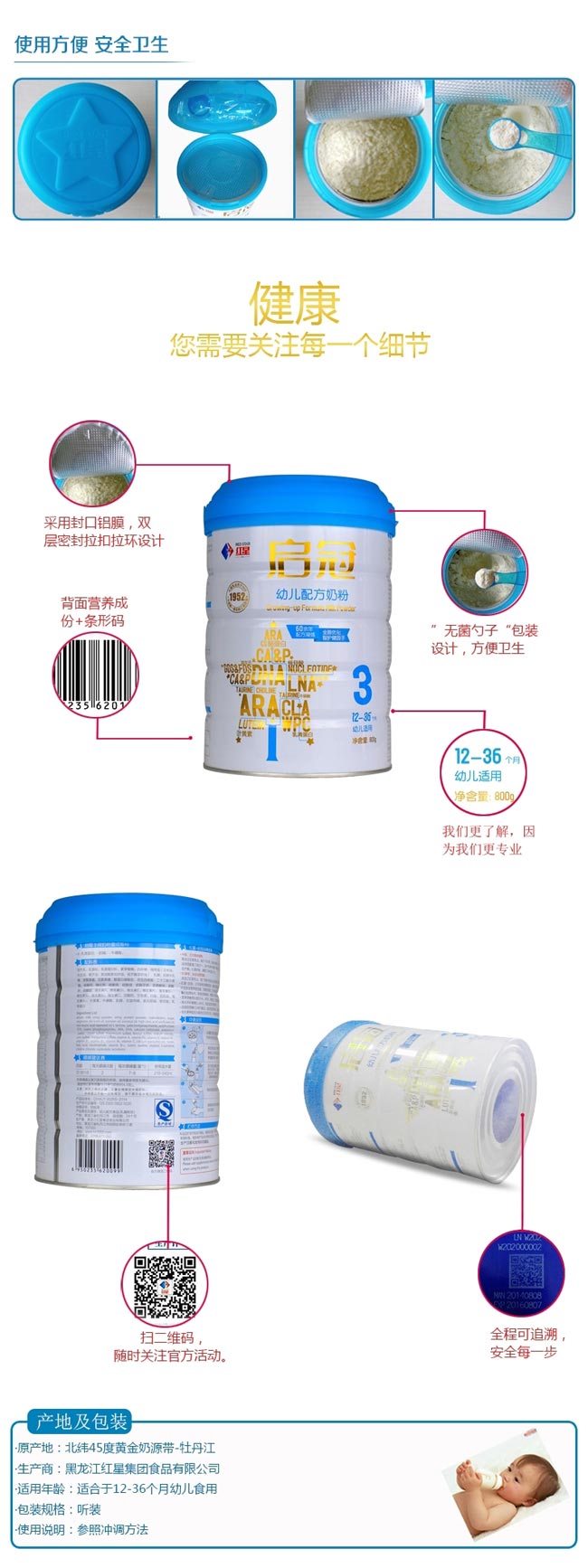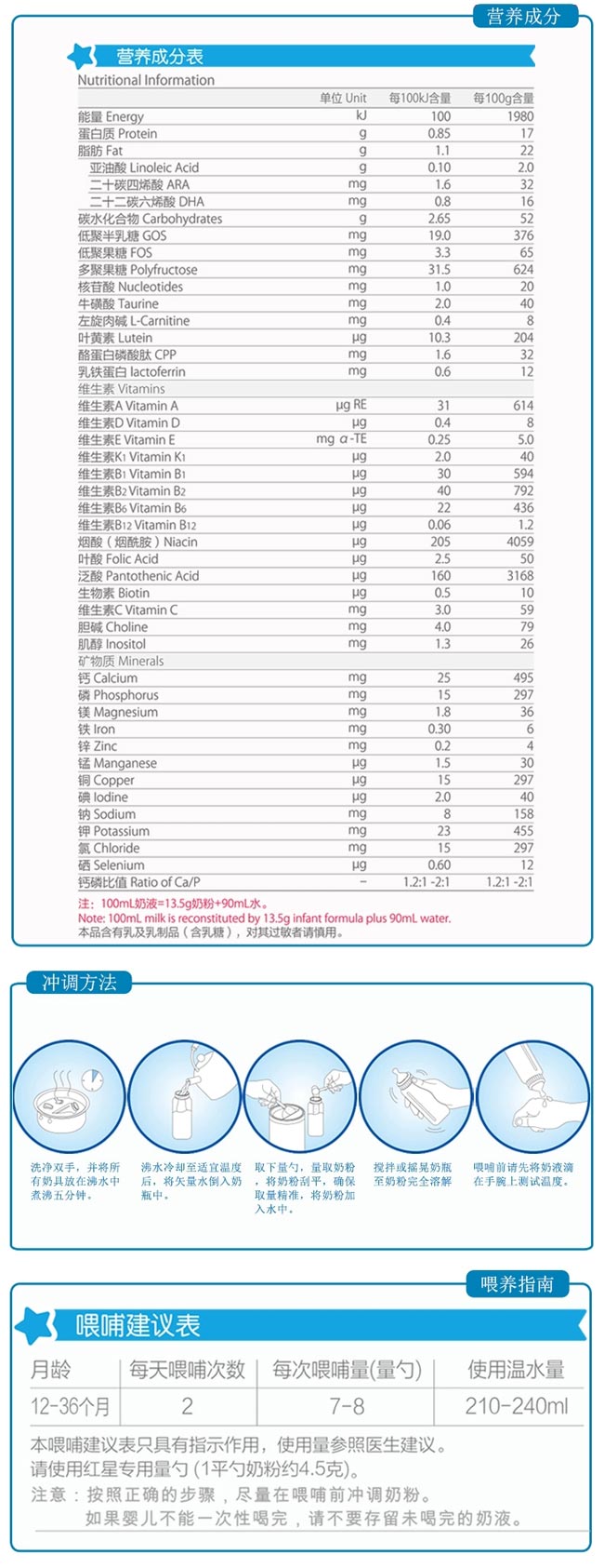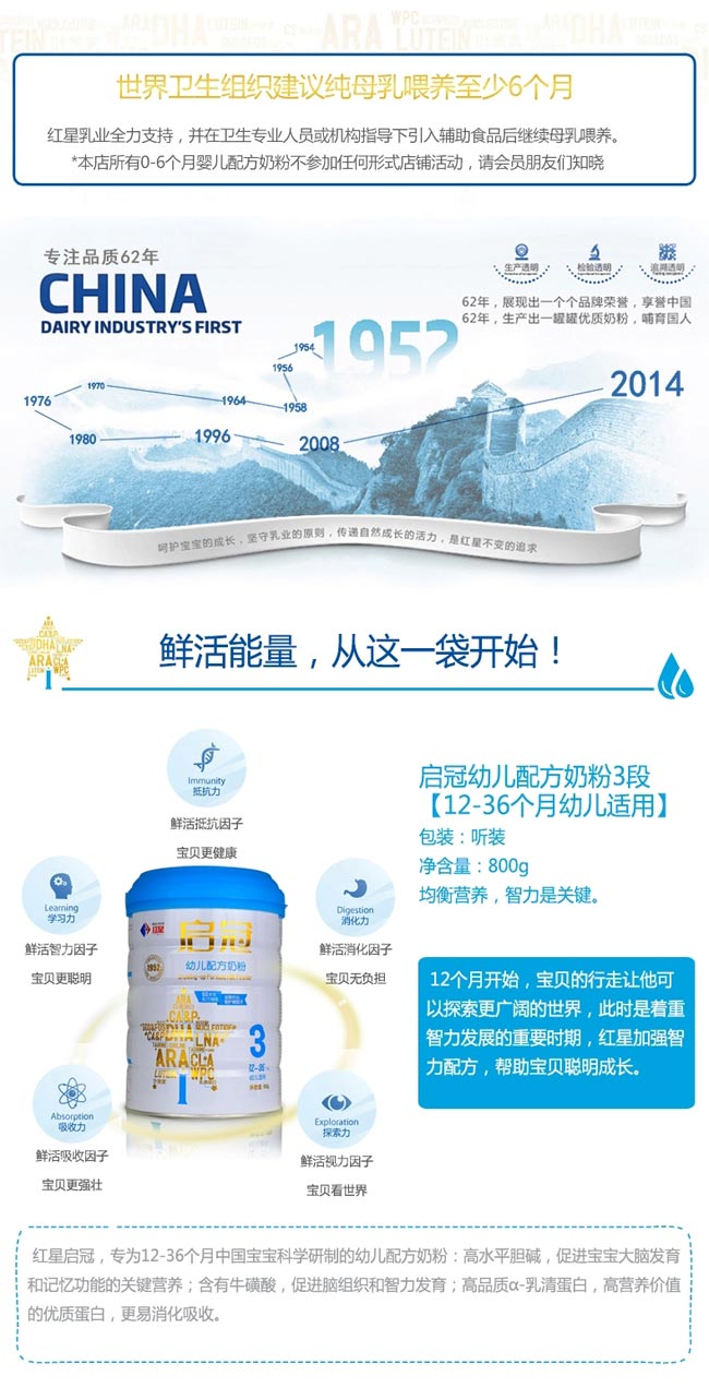 均衡營養(yǎng),免疫是關鍵。 12個月開始,寶貝的行走讓他可以探索更廣闊的世界,此時是著重智力發(fā)展的重要時期,紅星加強智力配方,幫助寶貝聰明成長。 紅星啟冠,專為12-36個月中國寶寶科學研制的幼兒配方奶粉: 高水平膽堿,促進寶寶大腦發(fā)育和記憶功能的關鍵營養(yǎng); 含有牛磺酸,促進腦組織和智力發(fā)育; 高品質α-乳清蛋白,高營養(yǎng)價值的優(yōu)質蛋白,更易消化吸收。 |