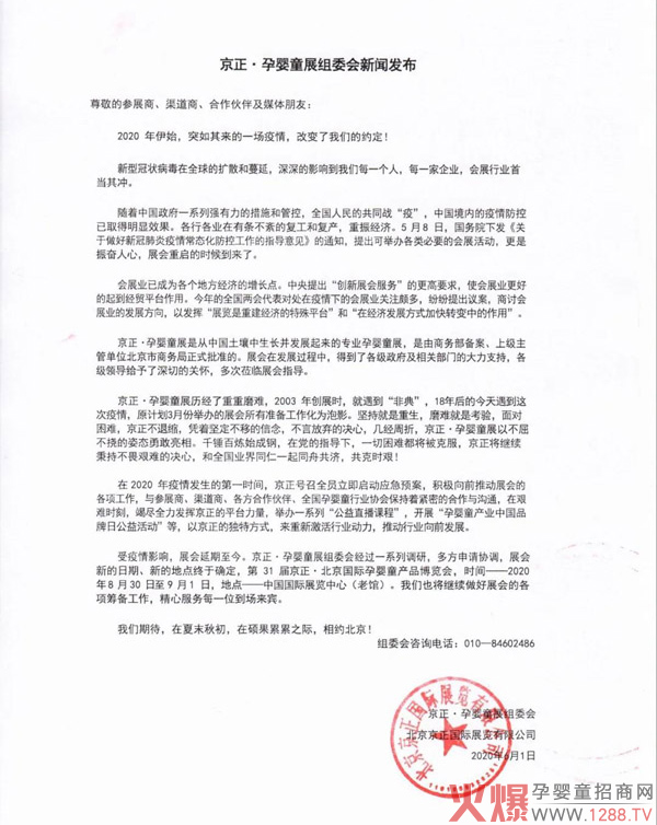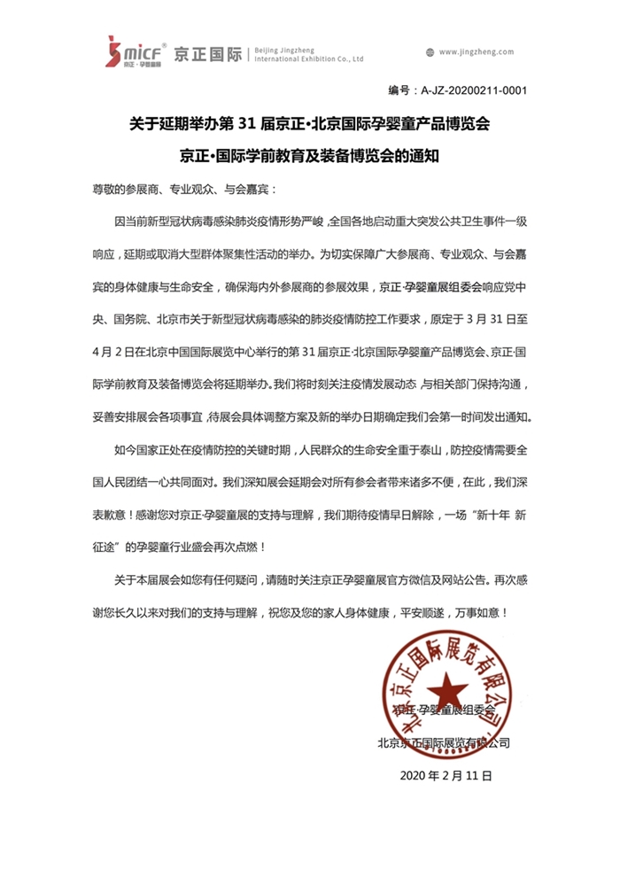 關于延期舉辦第31屆京正北京國際孕嬰童博覽會京正國際學前教育及裝備博覽會的通知。